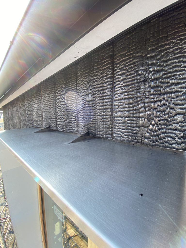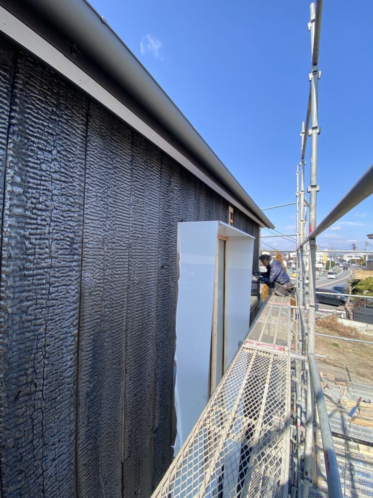 外部では焼杉張りが進む。