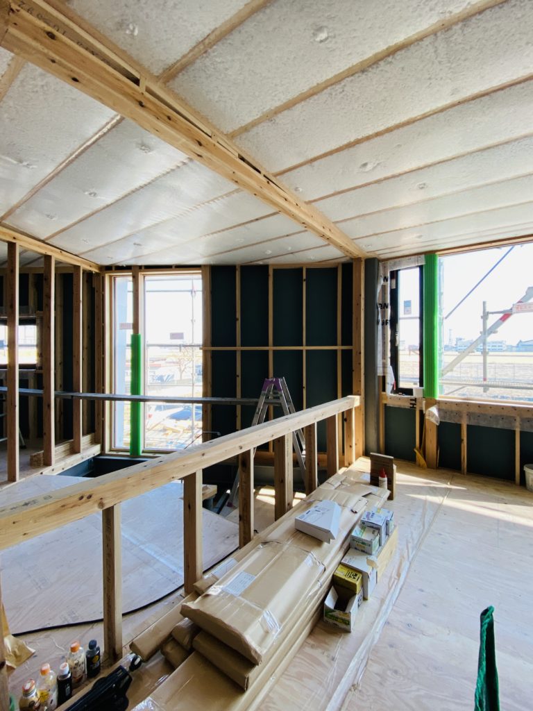 現場では、屋根断熱の吹き込みグラスウールが完了した。