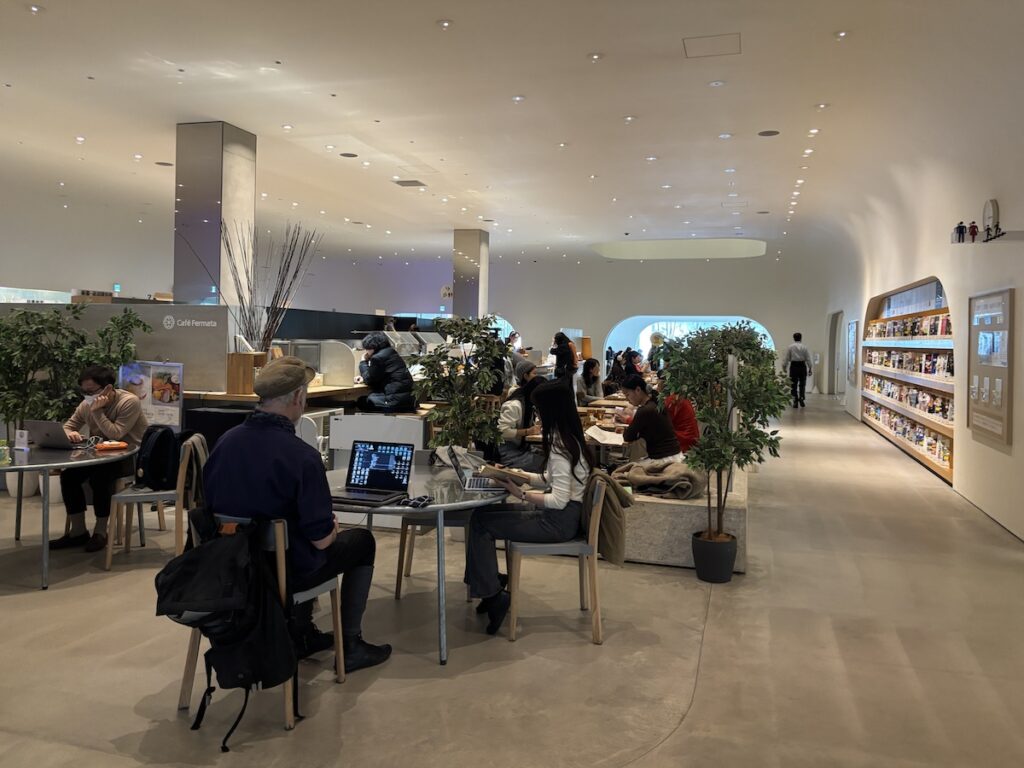 エントランスがある1階はカフェが併設されていて、ほぼ満席。皆さん、思い思いの時間を過ごしている様子でした。